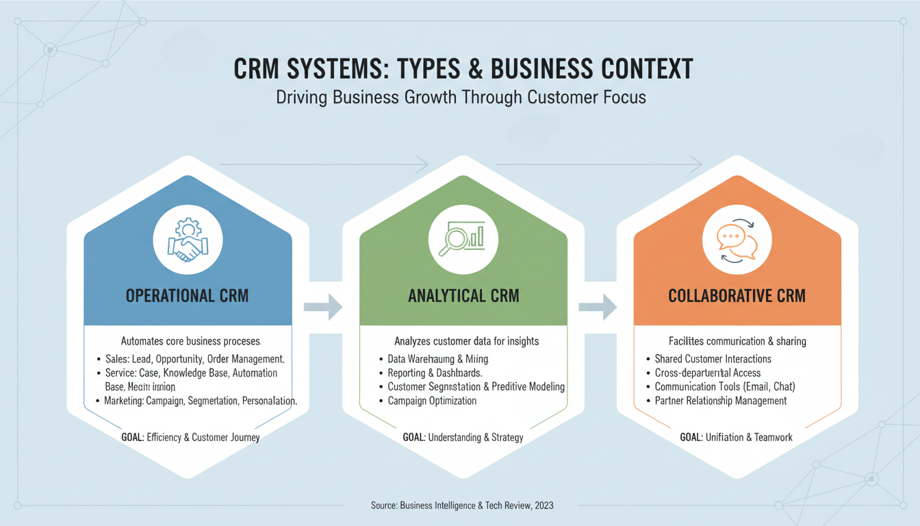 Operational CRM: Focused on daily processes (Sales/Service).